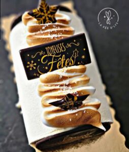 Elle porte le nom des étoiles et la douceur des fêtes. Un voile blanc, une lueur dorée, une meringue qui se consume comme une flamme douce dans la nuit d’hiver.